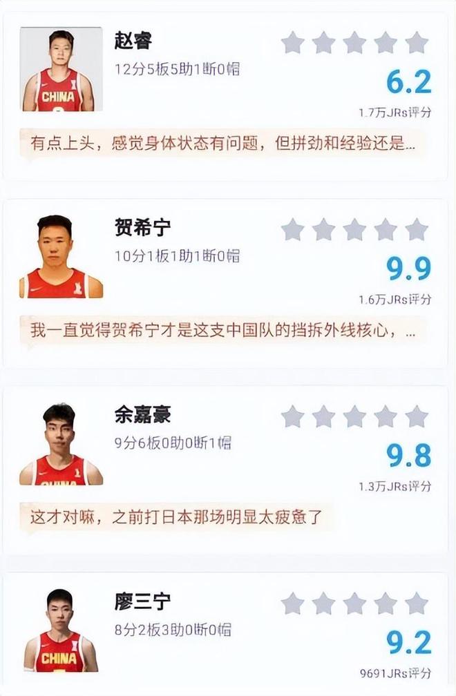 其他的球员中,余嘉豪、赵继伟、高诗岩和廖三宁的评分也比较高,都超过了9分。其中余嘉豪和赵继伟的评分是9.8分,高诗岩的评分是9.3分,廖三宁是9.2分。余嘉豪在这场比赛中得到了9分6个篮板,无论是进攻还是护框都非常不错,这才是他应该打出的表现。赵继伟延续了自己的良好状态,这场比赛中得到了13分3个篮板2次助攻的数据,虽然也出现了一些失误,不过他的拼抢非常积极,最后拼到五犯离场了。经过这两场比赛后,赵继伟也算是给自己正名了。